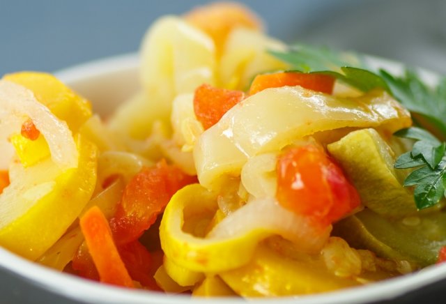 Огурцы на 3 часа замочите в холодной воде, остальные овощи вымойте. Помидоры и огурцы оставьте целыми, яблоко нарежьте дольками, перец разрежьте вдоль на несколько частей или кольцами, морковь нарежьте тонкой соломкой. Сложите все овощи и зелень в банку в желаемом порядке. Доведите воду до кипения и залейте банку до краев. Накройте ее стерилизованной крышкой и оставьте до полного остывания.