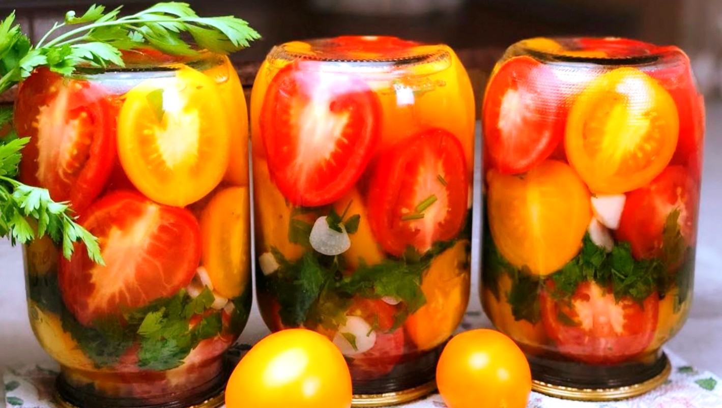 Помидоры по этому рецепту больше похожи на классические, бочковые овощи. Они такие же плотные, ароматные, с легкой кислинкой и сладостью, просто отличная закуска. Помидоры выбирайте не мягкие, можно для красоты и аппетитна брать красные, желтые и розовые томаты.