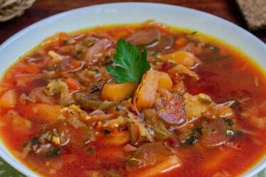 Морковь натереть на мелкой терке, лук нарезать соломкой, пассеровать на растительном масле. Как перловка почти сварится, добавить сныть и куриную печень, нарезанную крупным кубиком, варить 10 минут. Добавить пассировку, специи, рассол, соль и сахар по вкусу, рубленый укроп».
