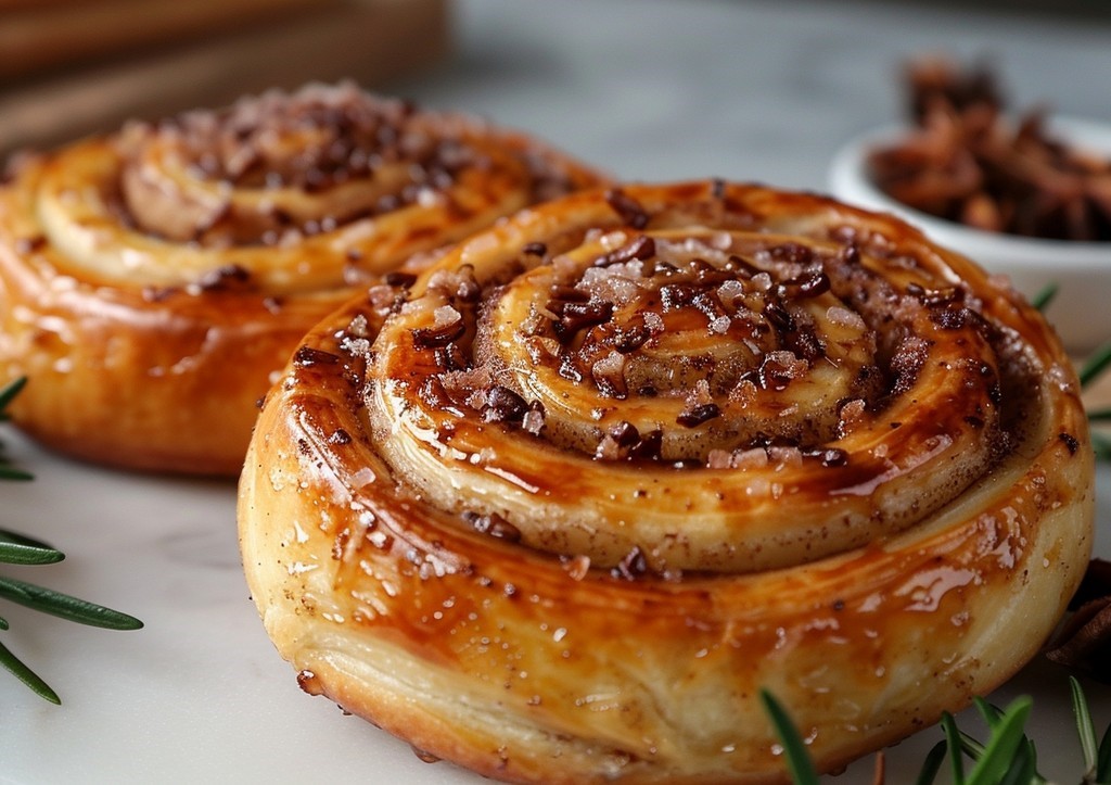 Соедините растопленное сливочное масло (50 г), сахар и корицу. Смажьте тесто сладкой смесью, скатайте рулет и нарежьте его на кусочки — это будущие булочки.