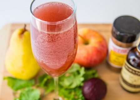 250 мл воды листья капусты кале 2 небольшие свёклы 1 груша 1 яблоко щепотка пряной смеси: молотая гвоздика, корица, имбирь и мускатный орех капля экстракта ванили газированная минеральная вода по вкусу. Подготовьте овощи и фрукты. Листья капусты промойте и просушите. Свёклу сварите, очистите и нарежьте на небольшие куски. Не сливайте сок — с ним вкуснее. …