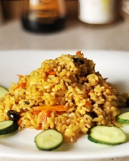 Обычный плов на растительном масле, с добавлением различных сухофруктов или свежих плодов айвы, абрикоса и многих других растений, нисколько не хуже мясного плова. рис круглый 2 ст. морковь крупная 1 шт.; лук репчатый крупный 1 шт. чеснок, головка – 1,5 шт.; барбарис 2 ч. л. зира 1 ч. л. куркума 0,5 ч. л. изюм 2 …