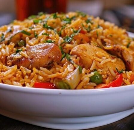 700 г куриного филе 500 г риса 1 шт. лука 2 ст. л. подсолнечного масла 1 головка чеснока приправа, соль по вкусу 2 шт. моркови Разрезать куриное филе на мелкие кубики. Порезать лук полукольцами, натереть морковь на крупной терке. Выложить куриное мясо в сковороду, добавив туда подсолнечное масло. Накрыть крышкой и оставить на 15 минут. Перемешать …