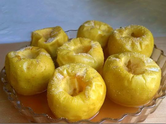 Готовится полезное блюдо просто — небольшие целые яблоки тушатся под крышкой с добавлением небольшого количества воды, после чего их посыпают корицей и выкладывают на тарелку.