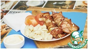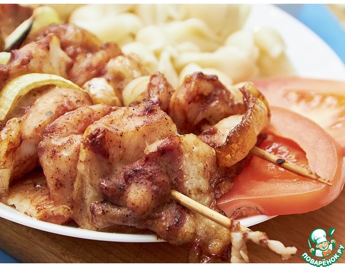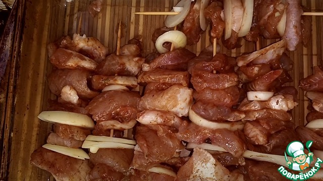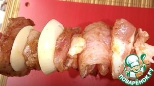 На шпажки накалываем рыбу, затем лук.