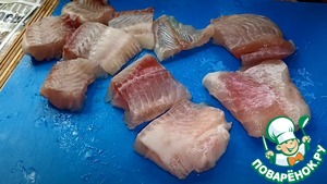 Затем рыбу нарезаем на кусочки.
