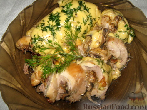 Аккуратно отделить куриное мясо от костей, чтобы получился целый пласт. Посолить, поперчить, добавить приправы. Нарезать шампиньоны. Выложить на пласт куриного мяса с одной стороны. На грибы уложить тоненький ломтик сыра.