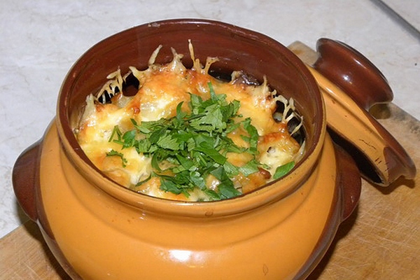 В конце разложить тертый сыр, когда он расплавится, говядину с шампиньонами и сметаной в горшочках можно доставать. Посыпать зеленью и подавать.