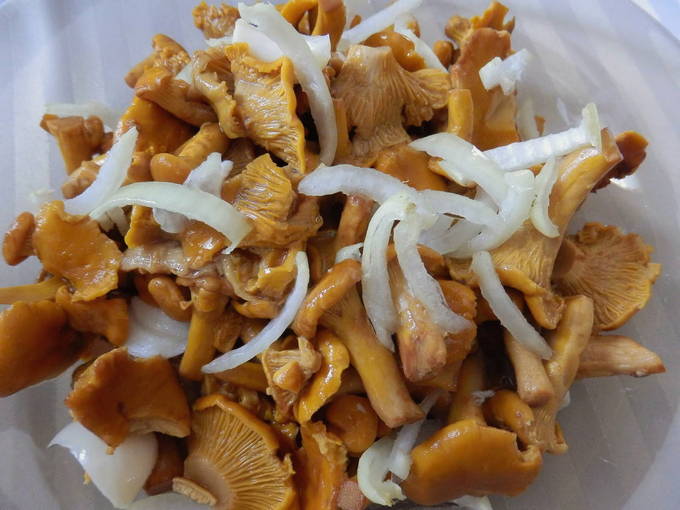 Грибы очищаем от мусора, хорошо промываем. Даем стечь воде. Чтобы легче было очищать лисички от листвы и травы, замочите их на 1 час в холодной воде.