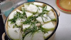 Нарезать кабачки полукольцами или крупными кусками, если кожура не нравиться — почистить.