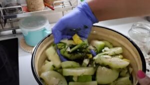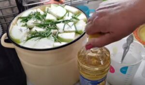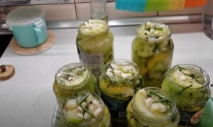 Готовим маринад. На 0,5 литра воды добавить 3 ст. л соли, 3 ст. л. сахара, перемешать и влить 3 ст.л уксусной кислоты 70% и залить кабачки.