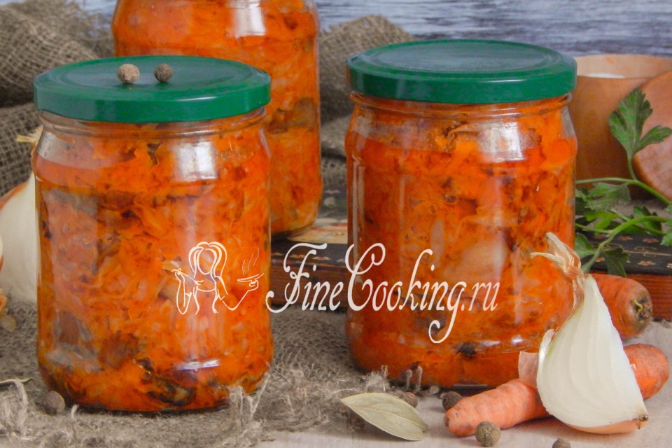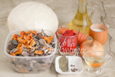 В рецепт грибной солянки на зиму входят следующие ингредиенты: белокочанная капуста, вареные лесные грибы, морковь, репчатый лук, рафинированное растительное (я использую подсолнечное) масло, томатная паста, соль, душистый перец горошек, лавровый лист, яблочный уксус.