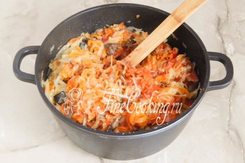 За это время белокочанная капуста заметно размягчится и станет прозрачной. Она уже почти готова, но еще слегка похрустывает.