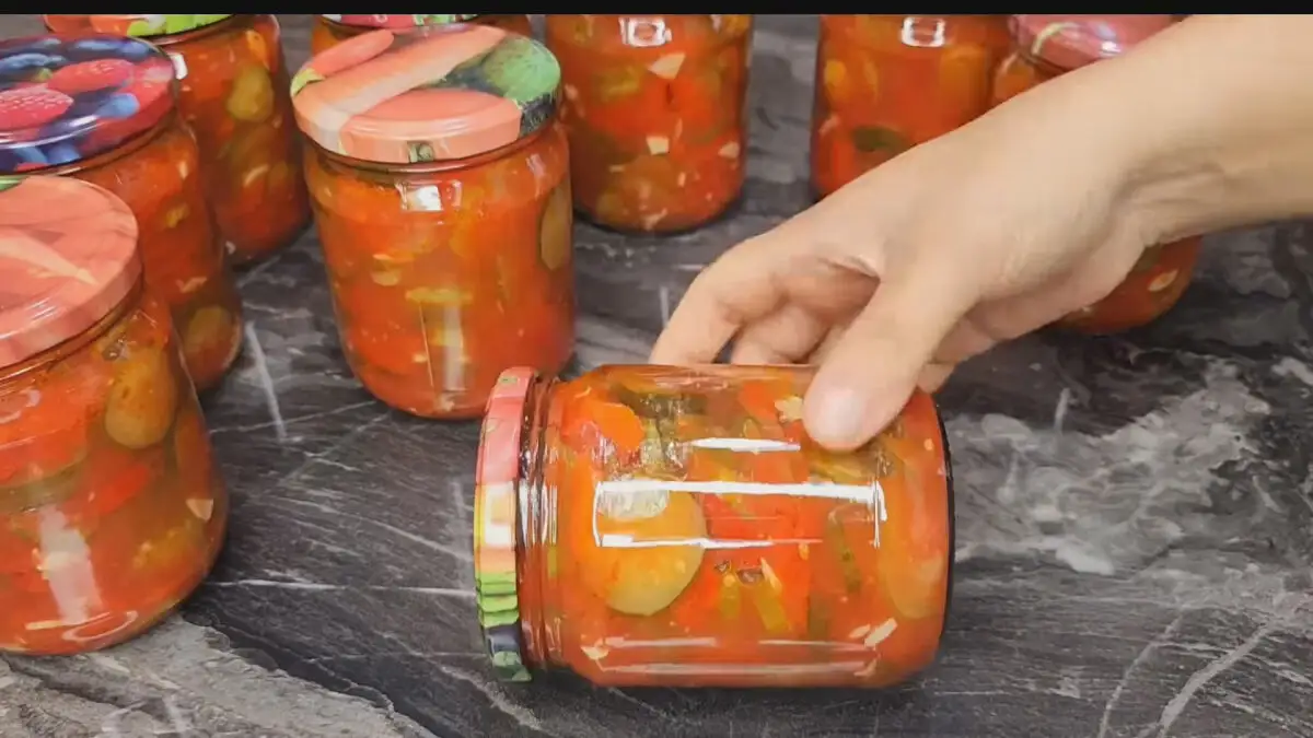 Огурцы нарезаем кружочками. Перец рубим на маленькие кусочки. Помидоры ошпариваем кипятком, удаляем кожицу, мелко шинкуем или пробиваем блендером. Чеснок выдавливаем. В большую кастрюлю бросаем перец, помидоры, соль, сахар, доводим до кипения и варим примерно 20 минут, помешивая.