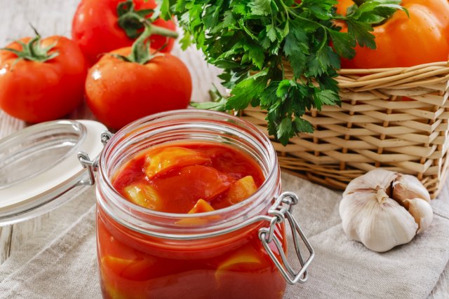 Половину помидоров нарежьте кусочками, так же нарежьте и перец. Сложите полученную массу в кастрюлю и доведите до кипения на среднем огне. Затем уменьшите его и варите в течение 15 минут. Добавьте оставшиеся помидоры и томите на медленном огне еще 15 минут. Насыпьте соль, сахар, чеснок, зелень и специи, перемешайте. Через 5 минут снимите лечо с огня, разложите по банкам, закройте стерилизованными крышками и закатайте.