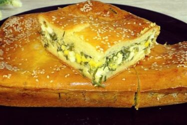 Через час пирог вынуть из духовки и оставить стоять около 15 минут, не раскрывая фольгу. Затем фольгу убрать, пирог порционно порезать.