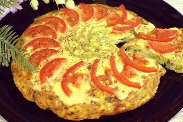 Колбасу нарезать кружочками, а потом соломкой, можно оставить кружочками при желании, добавить ее к жаренному луку, готовить еще примерно 2-3 минуты на минимальном огне. Помидоры помыть, вырезать лишнее и тоже нарезать соломкой.
