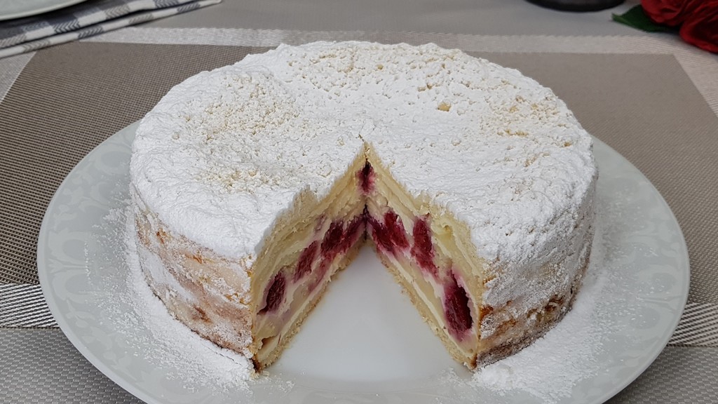 Убираем выпекаться в заранее разогретую до 180 градусов духовку на 60-70 минут до нежного золотистого цвета. Время выпечки будет зависеть от вашей духовки. Пирог должен подняться ровной, красивой шапочкой.