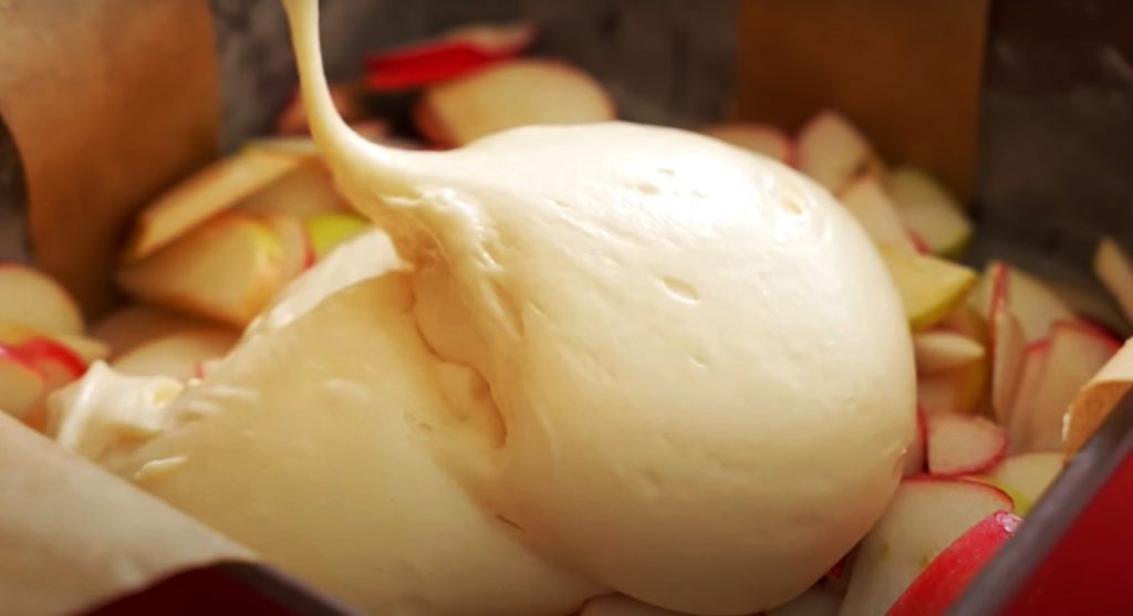 Выкладываем яблочный слой, разравниваем и заливаем тестом.