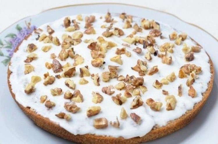 Морковный пирог по классическому рецепту готов. Остывший пирог обильно смазать кремом, присыпать грецкими орехами.