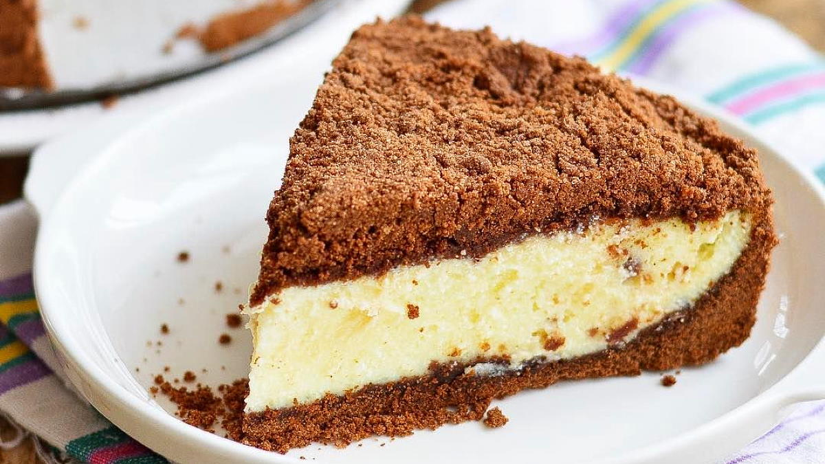 Половину крошки выложите в форму для запекания. Сверху распределите творожную начинку. Выложите оставшуюся крошку.