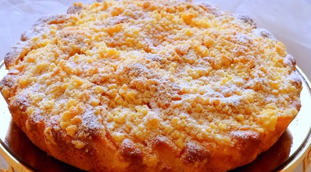 Мягкое и воздушное тесто отлично сочетается с персиковой начинкой. Пирог получается настолько легким и пышным, что больше напоминает торт. Украсить можете по вкусу кремом или просто сахарной пудрой.