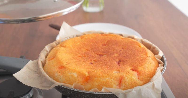 5. Сырой пирог накрывают крышкой и готовят на слабом огне около 25 минут. Образующийся конденсат на крышке периодически вытирают кусочком бумажного полотенца.