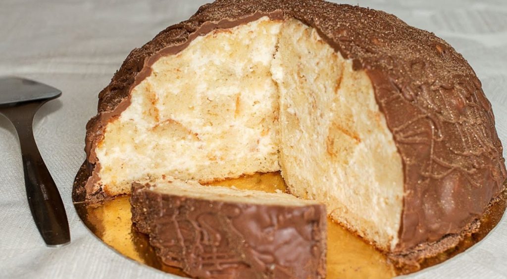 Корж смазываем немного кремом и накрываем им емкость с кубиками и кремом. Накрываем пленкой и отправляем в холодильник на 4 – 6 часов.
