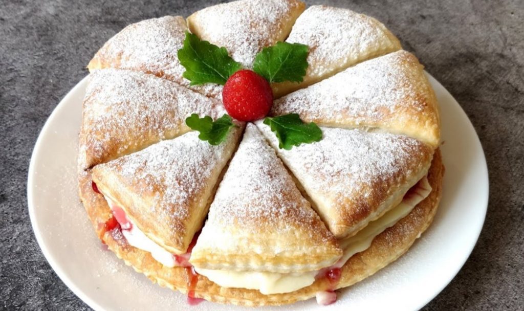 Быстрый и простой рецепт вкусного, нежного десерта с воздушным кремом и свежими ягодами. Основа торта – готовое слоеное тесто.
