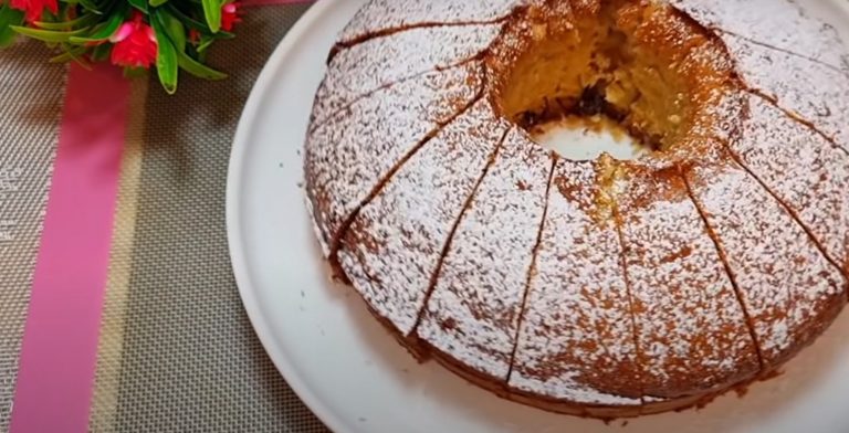 Остужаем пирог, посыпаем сахарной пудрой. К такой нежной текстуре теста, можно еще добавить самый простой крем из жирной сметаны и пары ложек сахарной пудры. Сверху посыпаем шоколадной крошкой и подаем этот роскошный десерт с богатым вкусом к чаю.