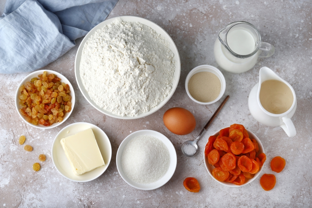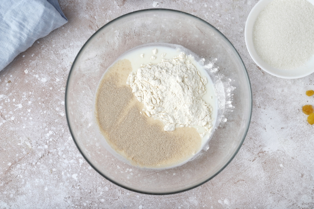 Приготовить опару: в миску налить половину от всего количества молока, добавить дрожжи, 1 ст.л. сахара и 2 ст.л. муки. Тщательно перемешать все ингредиенты, чтобы не было комочков.
