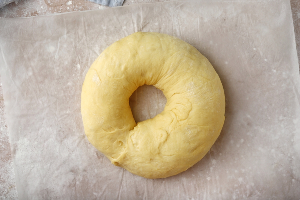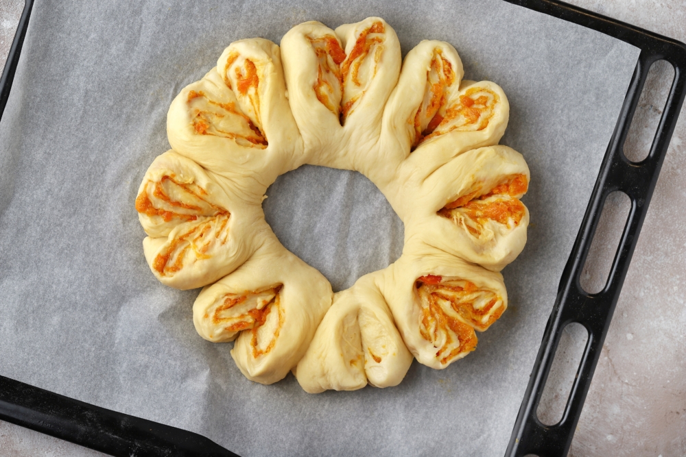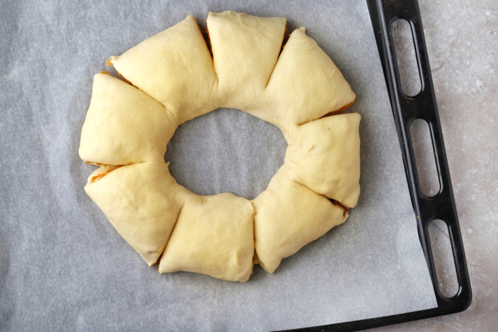 Свернуть полученный рулет в кольцо, тщательно защипнув края теста.