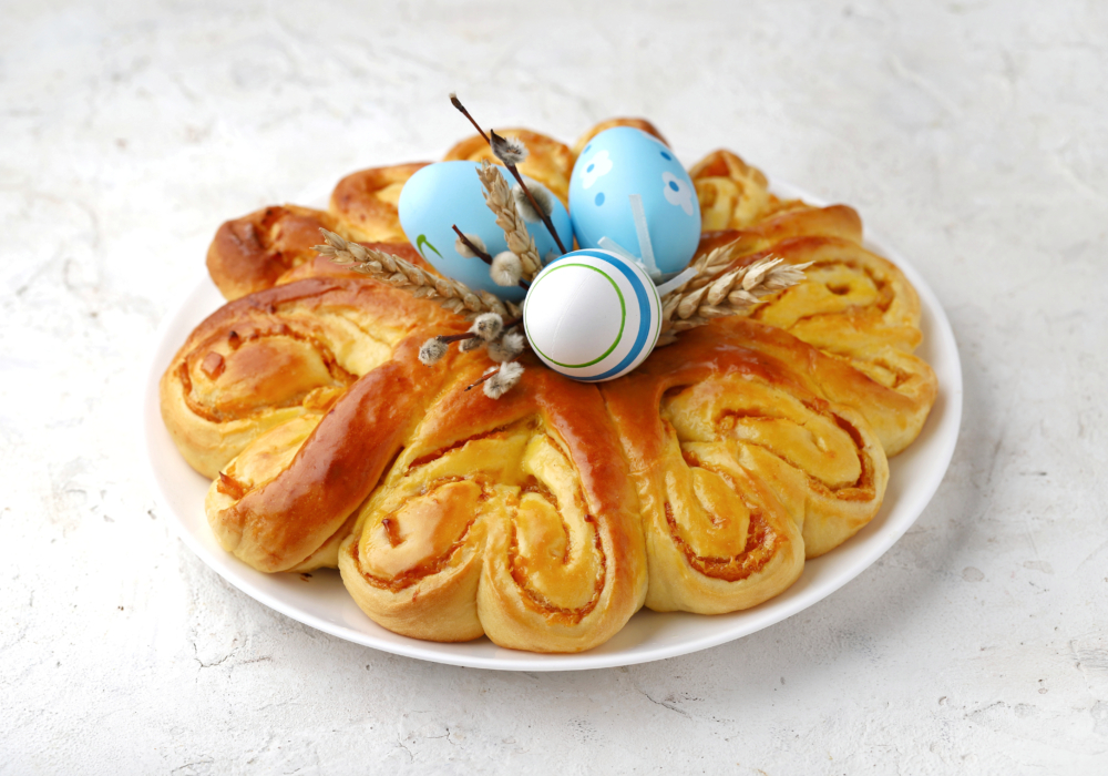 Очень эффектный и вкусный пасхальный пирог-венок с курагой удивит гостей и украсит праздничный стол. Тесто получается воздушным, а начинка кисло-сладкой. Такой пирог в середине можно украсить окрашенными яйцами или небольшой пасхальной композицией.