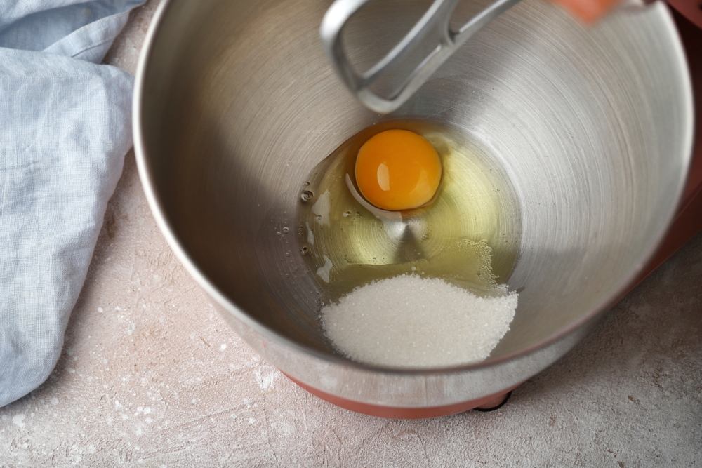 В отдельной емкости для замешивания теста яйцо взбить с сахаром до пышности.
