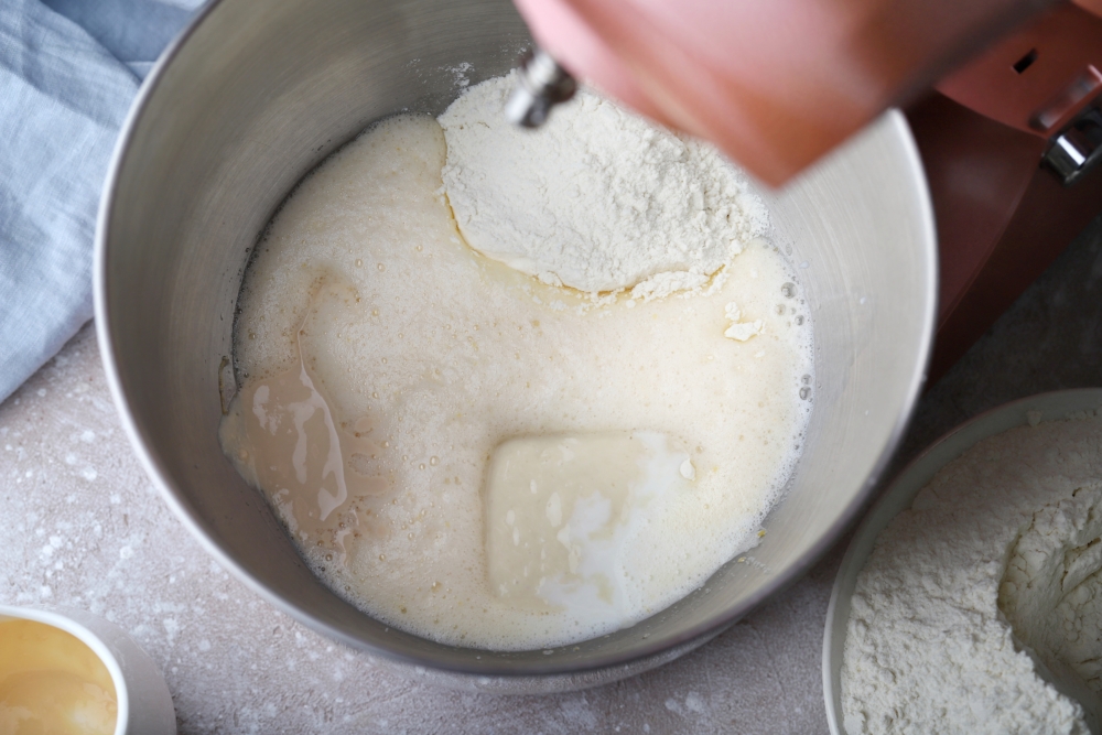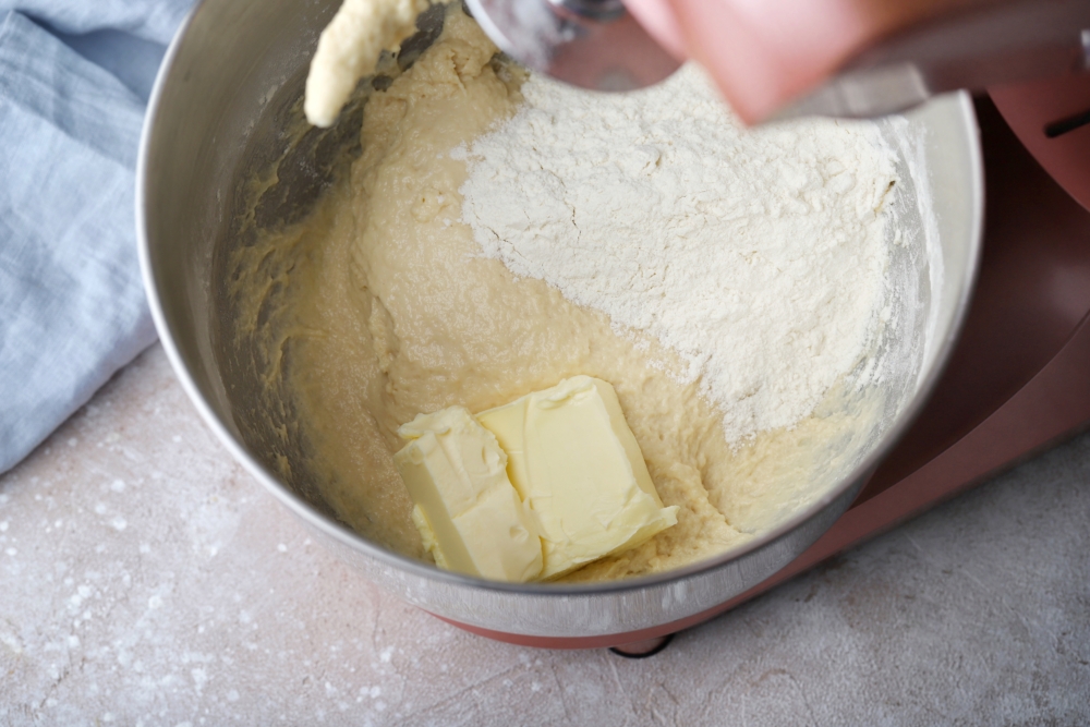 Добавить в тесто сливочное масло и оставшуюся муку, тщательно вымешивать тесто до однородности до тех пор, пока оно не перестанет липнуть к рукам, с помощью планетарного миксера с насадкой крюк или руками на присыпанной мукой поверхности в течение 5-7 минут.