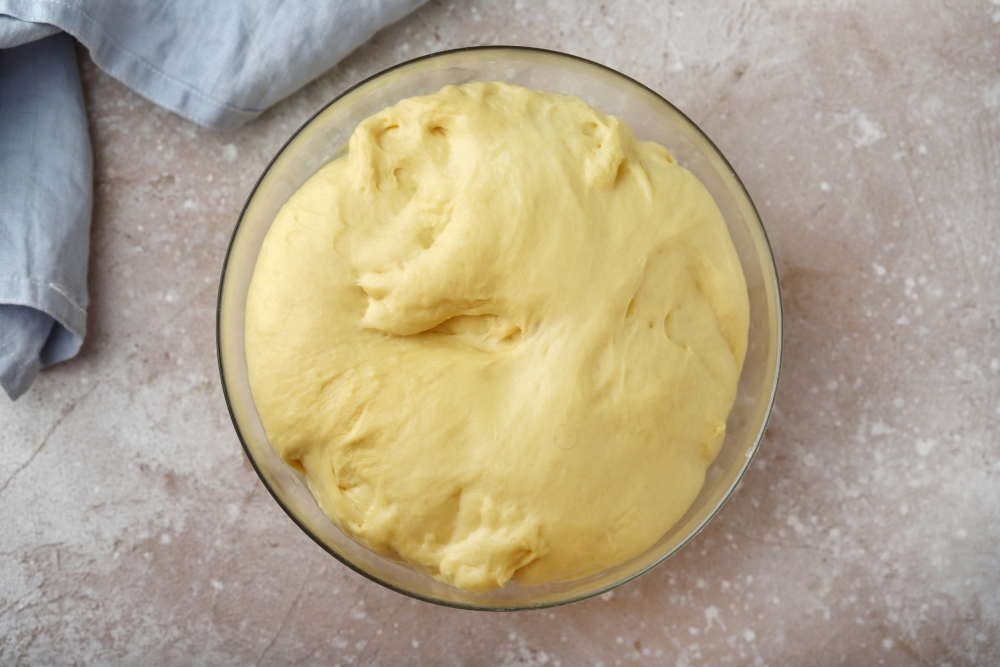 Миску смазать небольшим количеством растительного масла, положить в нее полученное тесто, накрыть его сверху полотенцем или салфеткой и убрать в теплое место подходить на 1,5-2 ч.