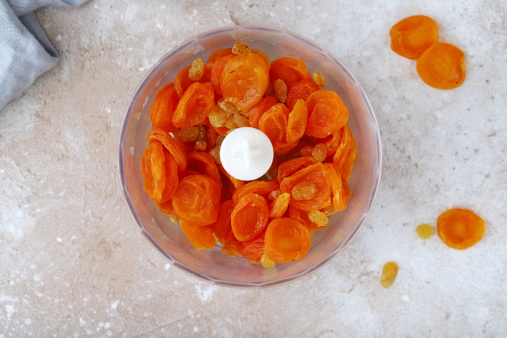 Промытую курагу и изюм измельчить блендером или с помощью мясорубки. Добавить в измельченные сухофрукты 50-60 мл воды и перемешать до однородности — должна получиться густая масса, по консистенции похожая на джем, которая легко намазывается.