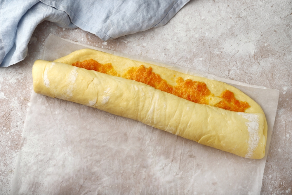 Аккуратно свернуть пласт теста в рулет с помощью листа пергамента или силиконового коврика, потянув его за края в направлении сворачивания рулета.