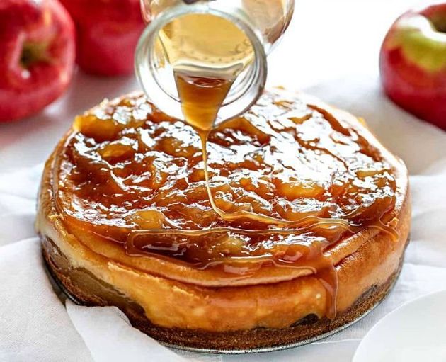 Готовую яблочно-карамельную смесь аккуратно поверх чизкейка и распределите ровным слоем.