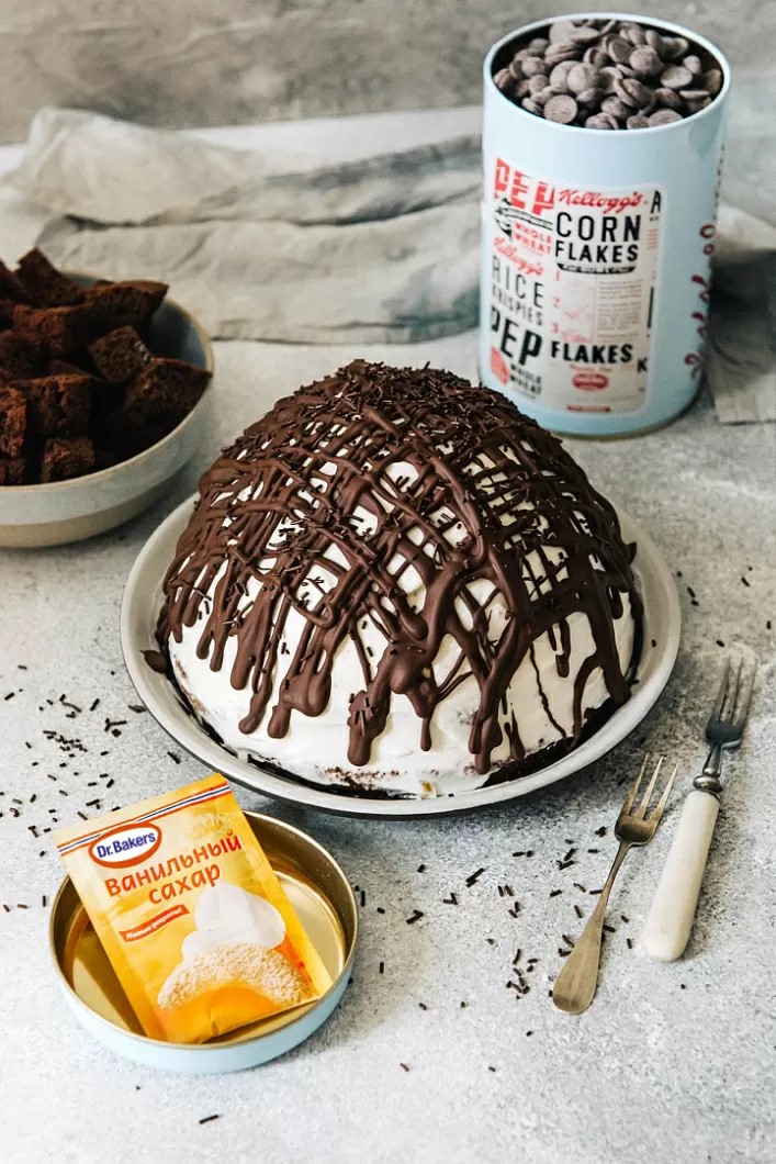 Для глазури: темный шоколад (60 г) и масло (20 г) топим на водяной бане. Даем слегка остыть, переливаем в кондитерский мешок и выливаем глазурь на торт. Сверху украшаем шоколадной кондитерской посыпкой.