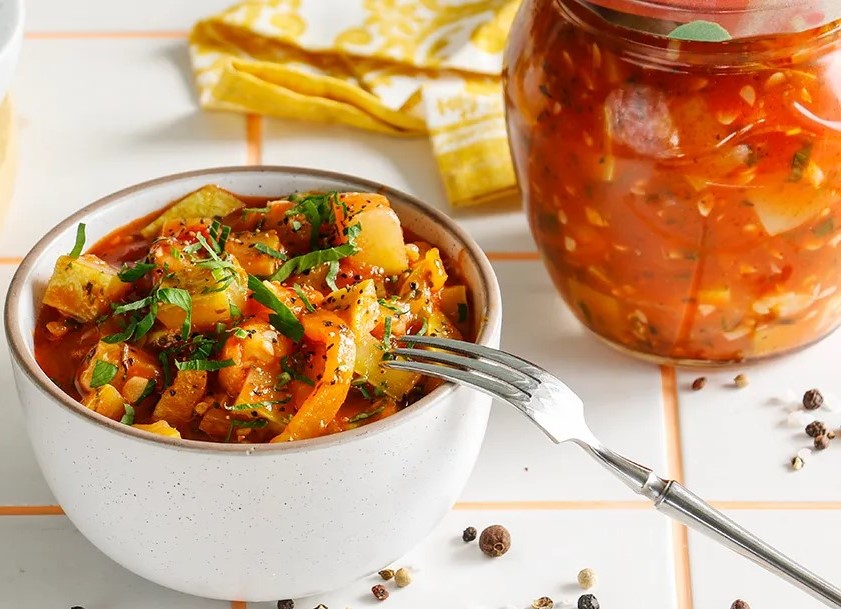 Выложите в томатную массу кабачки, доведите массу снова до кипения. Добавьте перец и репчатый лук. Варите смесь на медленном огне около получаса. Овощи должны стать достаточно мягкими, но не разваренными.