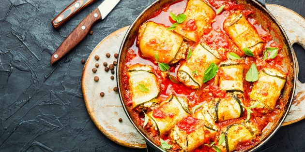 7. Запечённые рулетики из кабачков с фаршем, сыром и помидорами