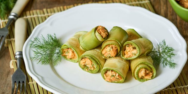 Смажьте каждую полоску кабачка сырной смесью и сверните рулетиками. При необходимости закрепите шпажками или зубочистками.