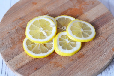 Половинку лимона нарежьте тонкими кружочками. Цитрусовые хорошо оттеняют вкус рыбы, которая сама по себе практически безвкусна. При этом красная рыба хорошо впитывает в себя ароматы специй и вкус ее зачастую зависит от того, с какими сопутствующими продуктами она будет готовиться. Рыба и лимон и/или лимонный сок — это классическое сочетание, обязательное в большинстве рецептов, где фигурирует рыба.