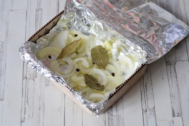В небольшую форму для запекания выложите двойной лист фольги. Это нужно, чтобы фольга не порвалась и сок от блюда не вытекал из конвертика. Сверху распределите порезанный лук. На лук выложите лавровые листья и перец горошком.