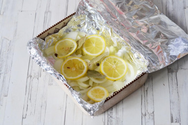 Аккуратно, чтобы не обжечься, разверните конвертик из фольги и подайте рыбу вместе с луком и лимоном к столу. При желании можно посыпать блюдо свежей зеленью. Приятного аппетита!