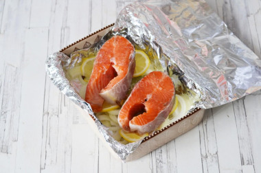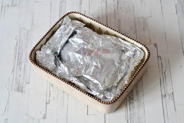 Тщательно заверните рыбу в фольгу, аккуратно собрав над ней края, чтобы сок не вытекал при запекании. Поставьте рыбу в разогретую до 200°С духовку на 25 минут.