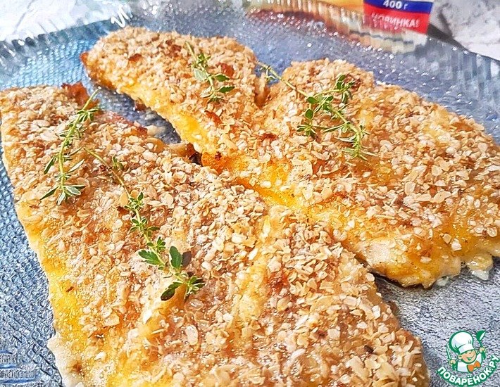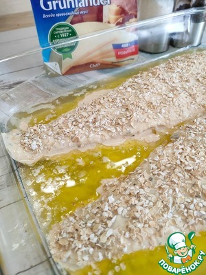 Присыпьте рыбу овсяными хлопьями и полейте растопленным сливочным маслом. Затем поставьте форму с рыбой в разогретую духовку (t — 200). Запекайте, примерно 30 минут. Выньте форму из духовки, накройте листом фольги и оставьте на 10 минут.
