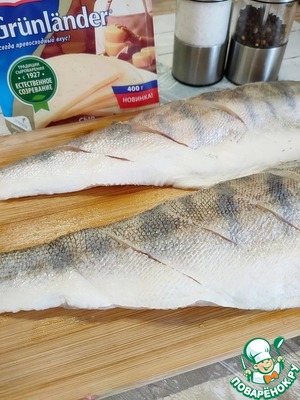 Рыбу (у меня судак) очистите от чешуи, выпотрошите. Хорошо промойте и обсушите бумажным полотенцем. Срежьте острые плавники и кончик хвоста. Разделите на два филе. Сделайте насечки на коже, чтобы рыба при жарке не деформировалась.