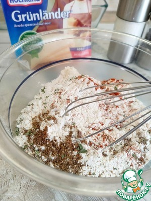 В миске соединить оба вида муки: в пшеничную добавьте кукурузную мелкого помола — она даст темпуре хрустящую текстуру и ровный золотистый цвет. Добавьте соль, красный перец, кориандр, семена зиры и орегано. Смесь хорошо перемешайте.